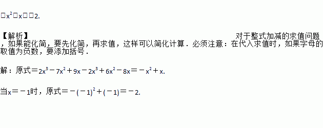 -x2+x;-2. 【解析】对于整式加减的求值问题,如果能化简,要先化简,再求值,这样可以简化计算.必须注意:在代入求值时,如果字母的取值为负数,要添加括号. 【解析】 原式=2x3-7x2+9x-2x3+6x2-8x=-x2+x. 当x=-1时,原式=-(-1)2+(-1)=-2.