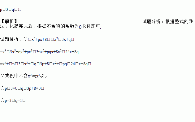 已知(x2+px+8)(x2-3x+q)的展开式中不含x2和x3项,求p,q的值.