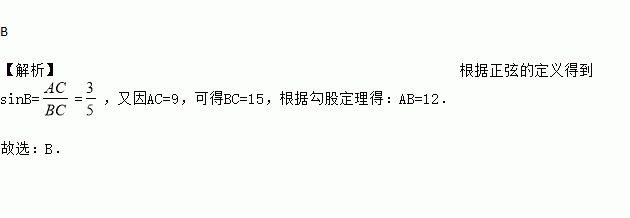 B 【解析】根据正弦的定义得到sinB==,又因AC=9,可得BC=15,根据勾股定理得:AB=12. 故选:B.