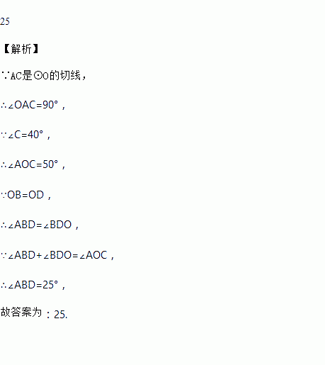 如图,AB是⊙O的直径,AC与⊙O相切于点A,连接OC交⊙O于D,连接BD,若∠C=40°,则∠B=_____度.