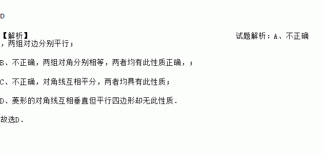D 【解析】试题解析:A、不正确,两组对边分别平行; B、不正确,两组对角分别相等,两者均有此性质正确,; C、不正确,对角线互相平分,两者均具有此性质; D、菱形的对角线互相垂直但平行四边形却无此性质. 故选D.
