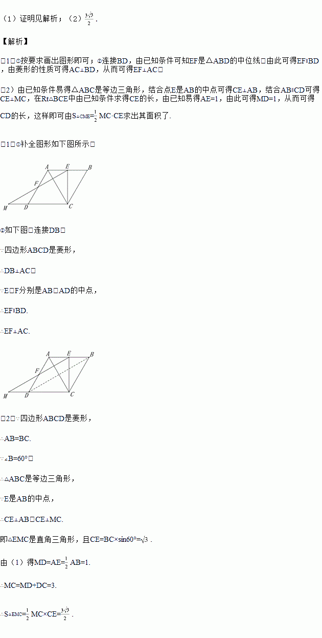 如图,四边形ABCD是边长为2的菱形,E,F分别是AB,AD的中点,连接EF,EC,将△FAE绕点F旋转180°得到△FDM.