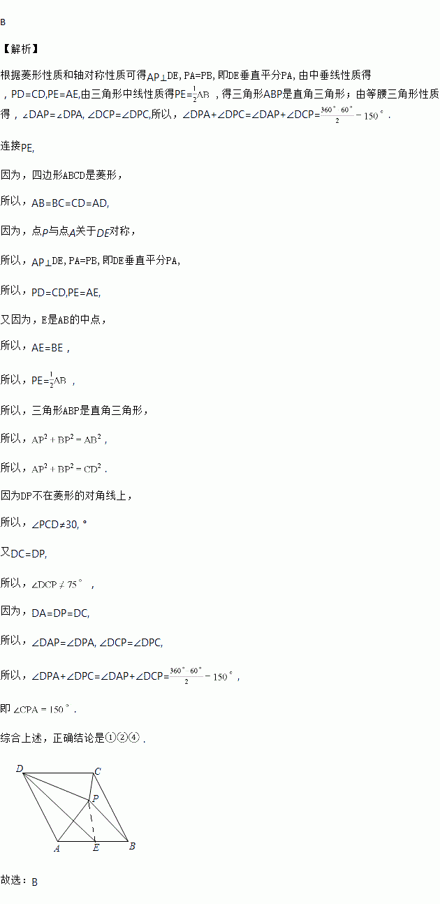 ,点E为AB边的中点,点P与点A关于DE对称,连接DP、BP、CP,下列结论:;![]()