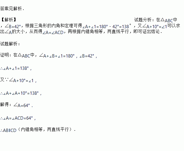 如图,∠B=42°,∠A+10°=∠1,∠ACD=64°,证明:AB∥CD.