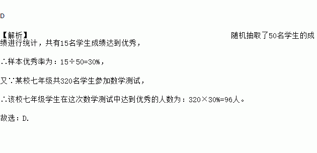 某校七年级共320名学生参加数学测试,随机抽取50名学生的成绩进行统计,其中15名学生成绩达到优秀,估计该校七年级学生在这次数学测试中达到优秀的人数大约有( )