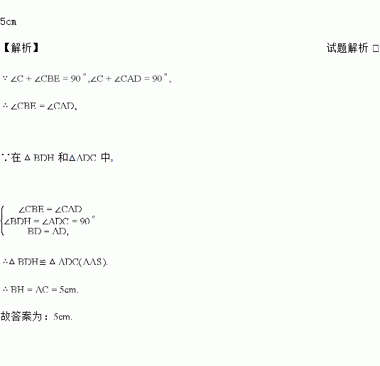 已知在ΔABC中,AD=BD,AC=5,BD=3,H是高AD和BE的交点,则线段BH的长度为______。