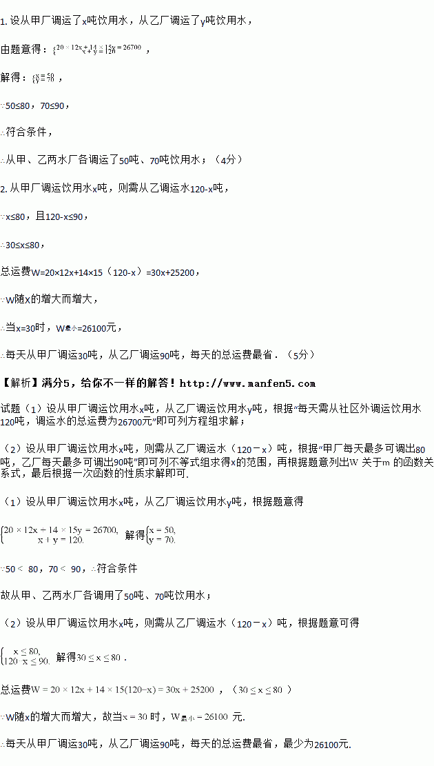 今年春北方严重干旱,某社区人畜饮水紧张,每天需从社区外调运饮用水120吨,有关部门紧急部署,从甲、乙两水厂调运饮用水到社区供水点,甲厂每天最多可调出80吨,乙厂每天最多可调出90吨,从两水厂运水到社区供水点的路程和运费如下表: