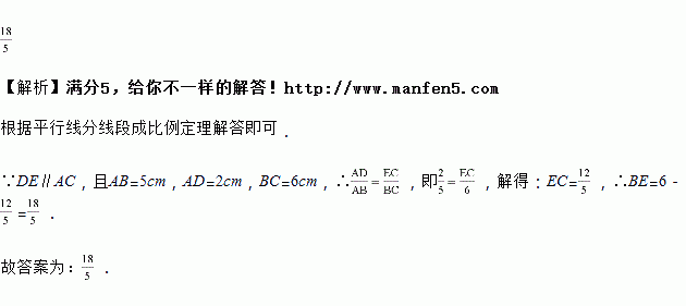 如图,在△ABC中,DE∥AC,且AB=5cm,AD=2cm,BC=6cm,则BE=_____.