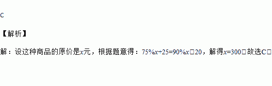某种商品因换季准备打折出售,如果按原定价的七五折出售,将赔25元,而按原定价的九折出售,将赚20元,则这种商品的原价是( )