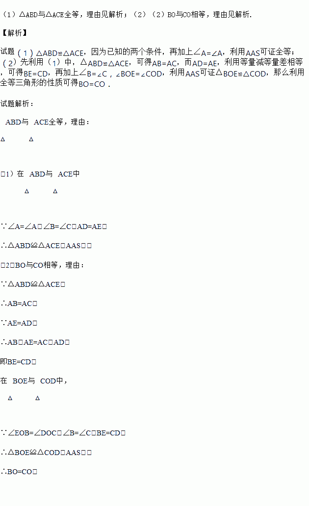 如图,已知,BD与CE相交于点O,AD=AE,∠B=∠C,请解答下列问题: