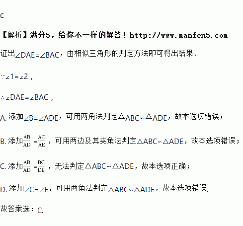 如图,已知∠1=∠2,则添加下列一个条件后,仍无法判定△ABC∽△ADE的是( )