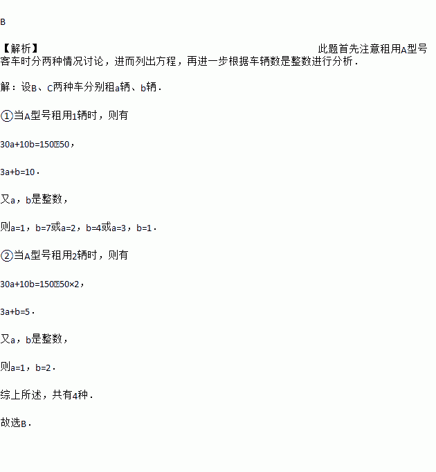 现有球迷150人欲同时租用A,B,C三种型号客车去观看世界杯足球赛,其中A,B,C三种型号客车载容量分别为50人,30人,10人,要求每辆车必须满载,其中A型客车最多租两辆,则球迷们一次性到达赛场的租车方案有( )