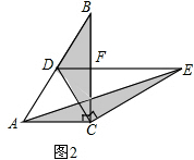 ②DE交BC于F,如图2,设AC=BC=a,DC=EC=b,由DE∥AC得到∠DFC=∠ACB=90°,则可判断△DFC为等腰直角三角形,所以DF=CF=$\frac{\sqrt{2}}{2}$CD=$\frac{\sqrt{2}}{2}$b,然后根据三角形面积公式计算出S1=$\frac{\sqrt{2}}{4}$ab,S2=$\frac{\sqrt{2}}{4}$ab,从而得到