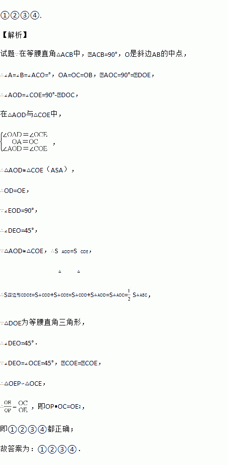 如图,在等腰直角△ACB中,∠ACB=90°,O是斜边AB的中点,点D、E分别在直角边AC、BC上,且∠DOE=90°,DE交OC于点P.有下列结论: