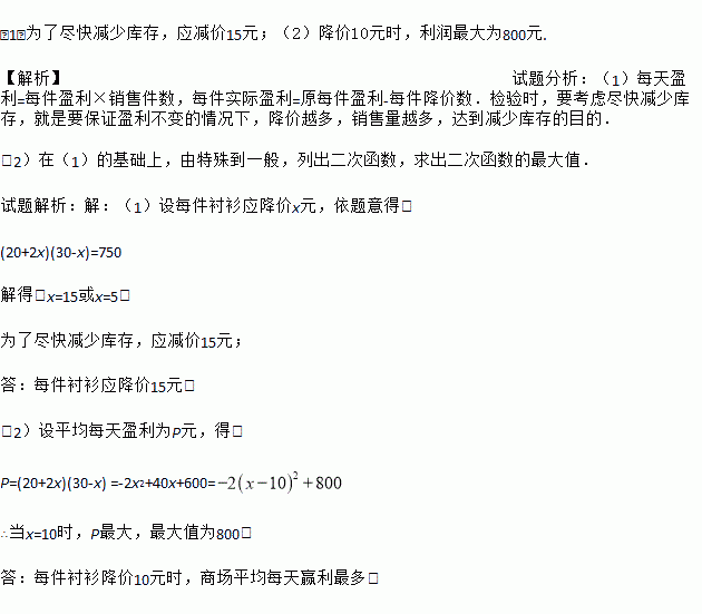 (1)为了尽快减少库存,应减价15元;(2)降价10元时,利润最大为800元. 【解析】试题分析:(1)每天盈利=每件盈利×销售件数,每件实际盈利=原每件盈利-每件降价数.检验时,要考虑尽快减少库存,就是要保证盈利不变的情况下,降价越多,销售量越多,达到减少库存的目的. (2)在(1)的基础上,由特殊到一般,列出二次函数,求出二次函数的最大值. 试题解析:【解析】 (1)设每件...