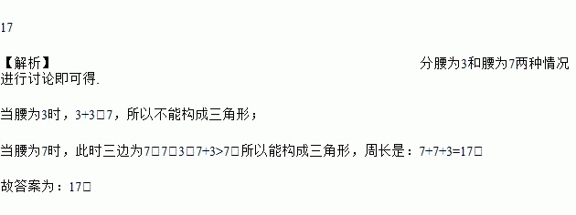 等腰三角形的两边长是3和7,则这个三角形的周长等于_____.