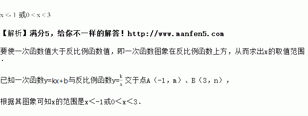 如图,一次函数与反比例函数交于点、,要使一次函数值大于反比例函数值,则的范围是________.