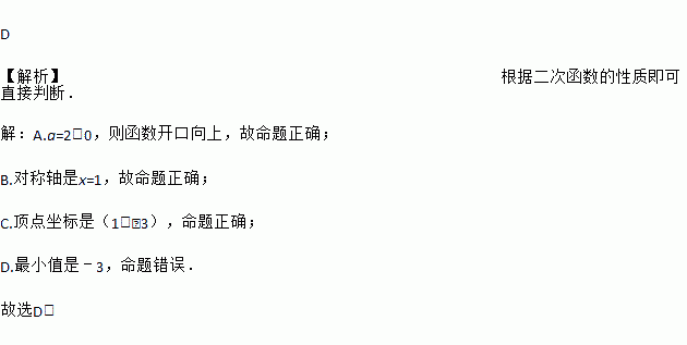 D 【解析】根据二次函数的性质即可直接判断. 【解析】 A.a=2>0,则函数开口向上,故命题正确; B.对称轴是x=1,故命题正确; C.顶点坐标是(1,﹣3),命题正确; D.最小值是﹣3,命题错误. 故选D.