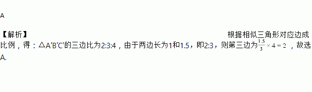在△ABC中,三条边的长分别为2、3、4,△A′B′C′的两边长分别为1、1.5,要使△ABC∽△A′B′C′,那么△A′B′C′的第三边长应该是( )