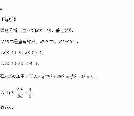 如图,在直角梯形ABCD中,AB∥CD,∠A=90°,AB=8,CD=4,DA=3,则sinB的值是( )
