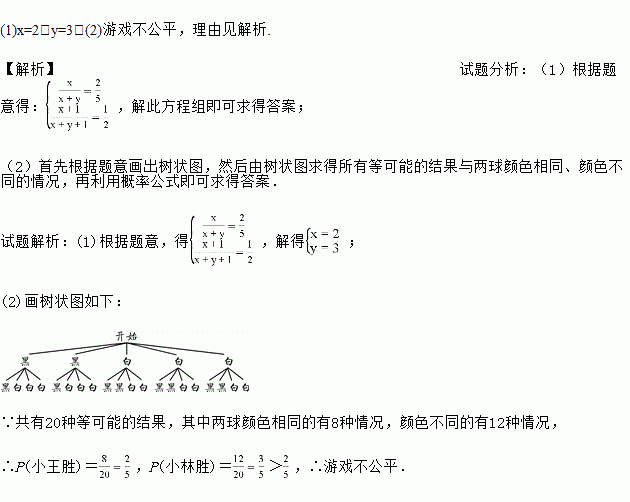 (2)小王和小林利用x个黑球和y个白球进行摸球游戏.约定:从盒中随机摸取一个,接着从剩下的球中再随机摸取一个,若两球颜色相同则小王胜,若颜色不同则小林胜.游戏公平吗?为什么?