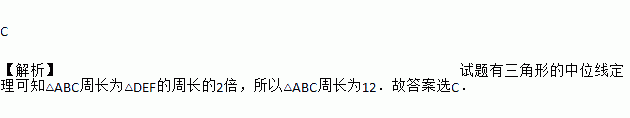 △ABC中,D、E、F分别为AB、AC、BC的中点, 若△DEF的周长为6,则△ABC周长为( ).