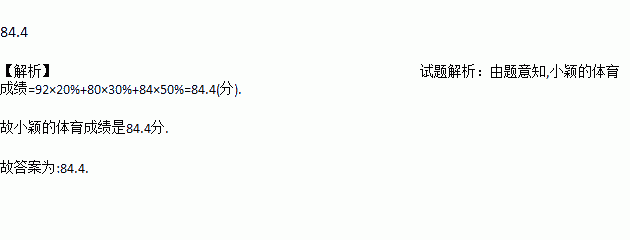 某校在期末考核学生的体育成绩时,将早锻炼及体育课外活动表现占成绩的20%,体育理论测试占30%,体育技能测试占50%。小颖的上述成绩分别为92分、80分、84分,则小颖这学期的体育成绩是___________分