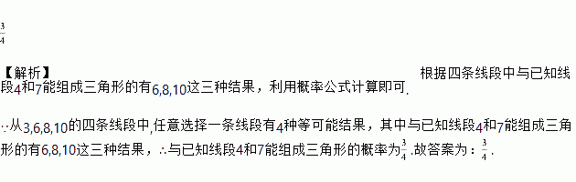 在长度为3,6,8,10的四条线段中,任意选择一条线段,使它与已知线段4和7能