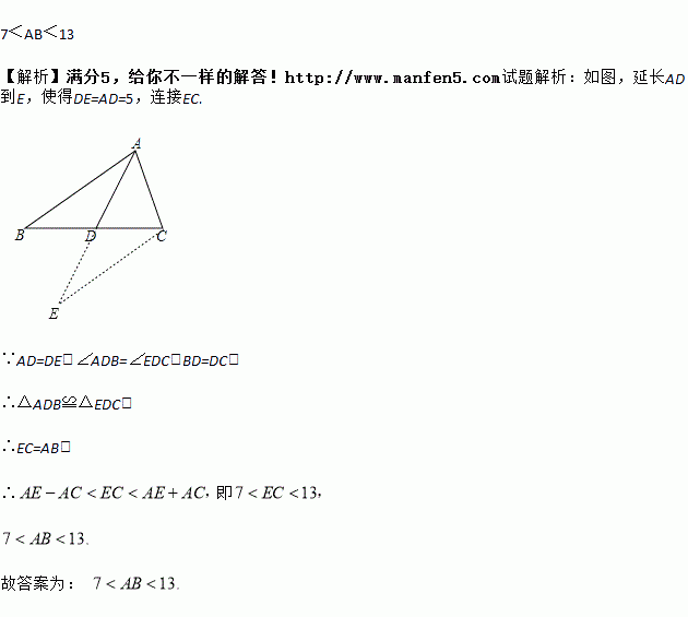如图,在△ABC中AC=3,中线AD=5,则边AB的取值范围是_____.