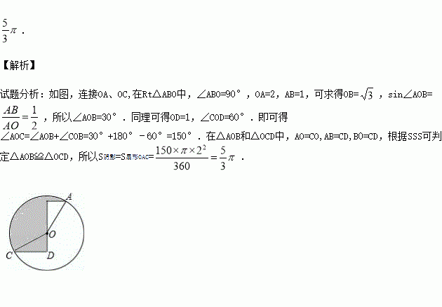 如图,圆O的半径为2,点A、C在圆O上,线段BC经过圆心O,∠ABD=∠CDB=90°,AB=1,CD=, 图中阴影部分的面积为 ..