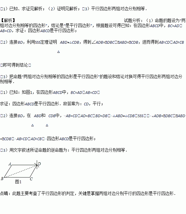 嘉淇同学要证明命题“两组对边分别相等的四边形是平行四边形”是正确的,她先用尺规作出了如图11的四边形ABCD,并写出了如下不完整的已知和求证。