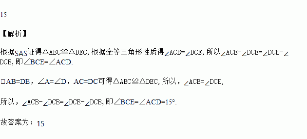 如图,已知AB=DE,∠A=∠D,AC=DC,若∠ACD=15°,则∠BCE=_____°.