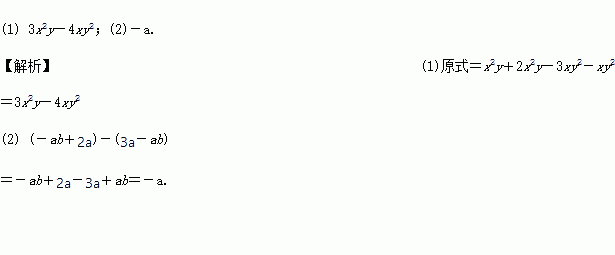 化简:(1) x2y-3xy2+2yx2-y2x;(2)(-ab+2a)-(3a-ab).