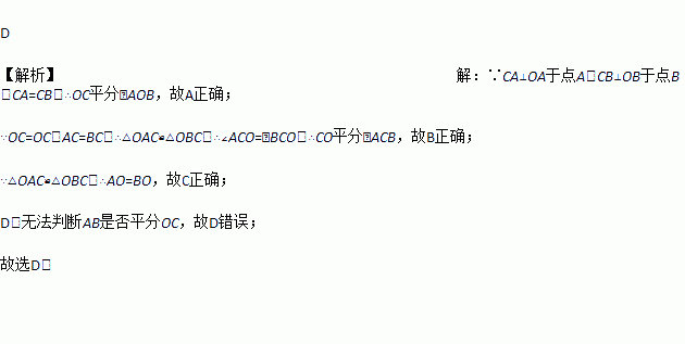 A. OC平分∠AOB B. CO平分∠ACB C. OA=OB D. AB垂直平分OC