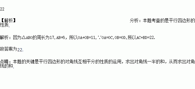 如图,在平行四边形ABCD中,已知对角线AC和BD相交于点O,△ABO的周长为17,AB=6,那么对角线AC+BD=_____。