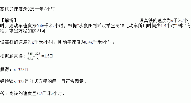 正在建设的“汉十高铁”竣工通车后,若襄阳至武汉段路程与当前动车行驶的路程相等,约为325千米,且高铁行驶的速度是当前动车行驶速度的2.5倍,则从襄阳到武汉乘坐高铁比动车所用时间少1.5小时.求高铁的速度.