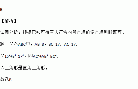 在△ABC中,AB=8,AC=15,BC=17,则该三角形为( )