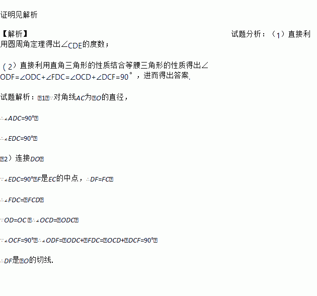Ö¤Ã÷¼û½âÎö ¡¾½âÎö¡¿ÊÔÌâ·ÖÎö£º£¨1£©Ö±½ÓÀûÓÃÔ²ÖܽǶ¨ÀíµÃ³ö¡ÏCDEµÄ¶ÈÊý£» £¨2£©Ö±½ÓÀûÓÃÖ±½ÇÈý½ÇÐεÄÐÔÖʽáºÏµÈÑüÈý½ÇÐεÄÐÔÖʵóö¡ÏODF=¡ÏODC+¡ÏFDC=¡ÏOCD+¡ÏDCF=90¡ã£¬½ø¶øµÃ³ö´ð°¸. ÊÔÌâ½âÎö£º£¨1£©¡ß¶Ô½ÇÏßACΪ¡ÑOµÄÖ±¾¶£¬ ¡à¡ÏADC=90¡ã£¬ ¡à¡ÏEDC=90¡ã£» £¨2£©Á¬½ÓDO£¬ ¡ß¡ÏEDC=90¡ã£¬FÊÇECµÄÖе㣬¡àDF=FC...
