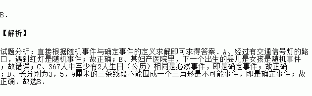 B. 【解析】 试题分析:直接根据随机事件与确定事件的定义求解即可求得答案.A、经过有交通信号灯的路口,遇到红灯是随机事件;故正确;B、某妇产医院里,下一个出生的婴儿是女孩是随机事件;故错误;C、367人中至少有2人生日(公历)相同是必然事件,即是确定事件;故正确;D、长分别为3,5,9厘米的三条线段不能围成一个三角形是不可能事件,即是确定事件;故正确.故选B.
