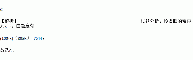 C 【解析】试题分析:设道路的宽应为x米,由题意有 (100-x)(80﹣x)=7644, 故选C.