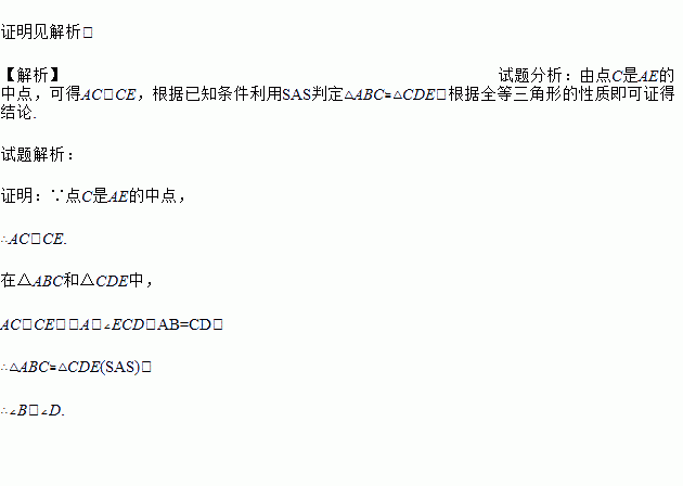 如图,点C是AE的中点,∠A=∠ECD,AB=CD,求证:∠B=∠D.