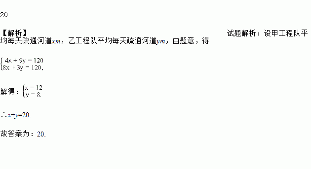 某地准备对一段长120 m的河道进行清淤疏通.若甲工程队先用 4天单独完成其中一部分河道的疏通任务,则余下的任务由乙工程队单独完成需要9天;若甲工程队先单独工作8天,则余下的任务由乙工程队单独完成需要3天.设甲工程队平均每天疏通河道xm,乙工程队平均每天疏通河道y m,则的值为_______.![]()