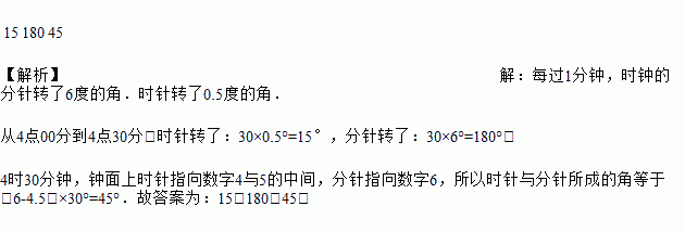 从4点00分到4点30分,时钟的时针转了_______°,分针转了_______°;4点30分时,时针和分针的夹角是_______°.