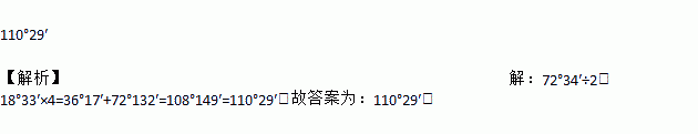 110°29′ 【解析】【解析】 72°34′÷2+18°33′×4=36°17′+72°132′=108°149′=110°29′.故答案为:110°29′.