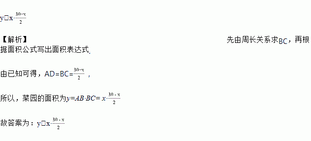 如图所示,用一段长为30米的篱笆围成一个一边靠墙(墙的长度不限)的长方形菜园ABCD.设AB边的长为x米,则菜园的面积y(单位:平方米)与x(单位:米)的关系式为__________.