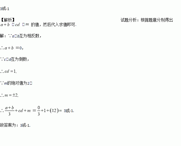 若a、b互为相反数,c、d互为倒数,m的绝对值为2,则: 的值为_________________.