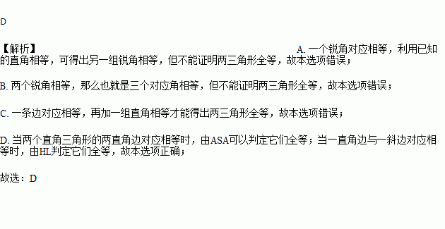 A. 一个锐角对应相等 B. 两个锐角对应相等