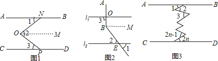分析:(1)过O作OM∥AB,推出AB∥OM∥CD,根据平行线性质得出∠1=∠NOM,∠3=∠MOP,即可求出答案;