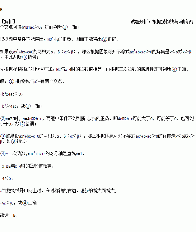 ①b2>4ac; ②4a-2b+c<0; ③不等式ax2+bx+c>0的解集是x≥3.5; ④若(-2,y1),(5,y2)是抛物线上的两点,则y1<y2.