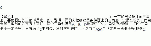 C 【解析】由一定的已知条件画三角形,要使画出的三角形是唯一的,说明不同的人根据这些条件画出的三角形一定是全等的;而由全等三角形的判定方法可知当两个三角形满足A、B、D选项中的边、角对应相等时,两个三角形不一定全等,只有满足C中的边、角对应相等时,可以由“ASA”判定两三角形全等.故选C.